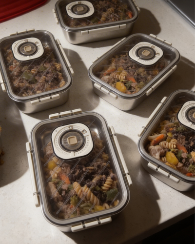 Lunch-size vacuum containers made in Non-Porous 304 Stainless steel allow you to seal soups, stews, and marinades. The containers are dishwasher, freezer, refrigerator, and microwave-safe.